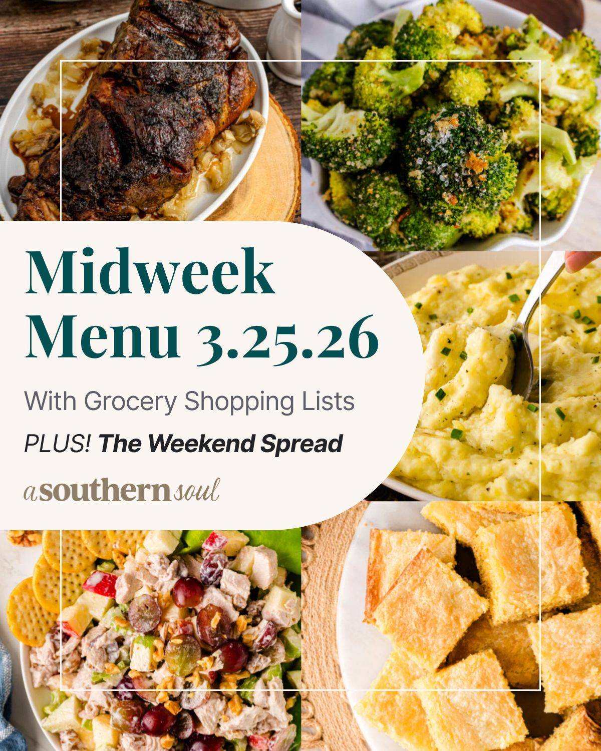 Hey Reader, This week we are making crock pot balsamic and brown sugar glazed pork roast, roasted broccoli, Boursin mashed potatoes, and Neiman Marcus cake for dessert. And The Weekend Spread, to help you relax with friends and family, featuring: Waldorf chicken salad, the best meat marinade, lemon poppy seed muffins, and deviled egg pasta salad. Get This Meal Plan! Pin for Later On the Menu: • Main: Crock Pot Glazed Pork Roast - This balsamic and brown sugar pork cooks low and slow until...