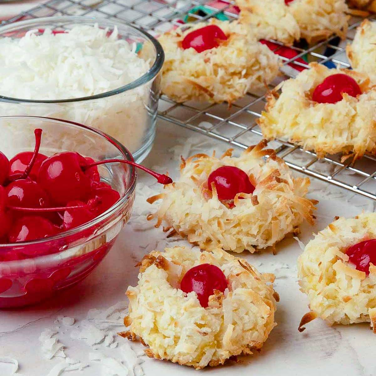 These delicious cookies have all the flavors of the classic holiday salad with pineapple, coconut, and red maraschino cherries.
