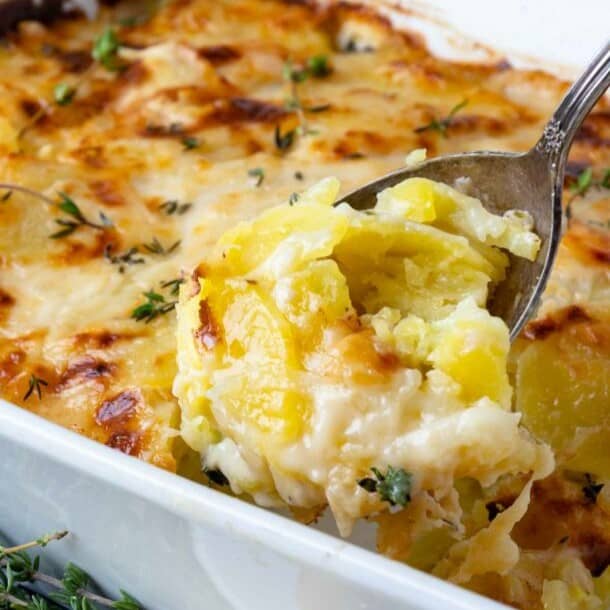 Tender, thinly sliced potatoes are baked in a rich, creamy sauce for a side dish that’s excellent to serve alongside any main course
