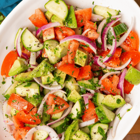 A light, refreshing side made with ripe tomatoes, crisp cucumbers, and a simple herb vinaigrette.