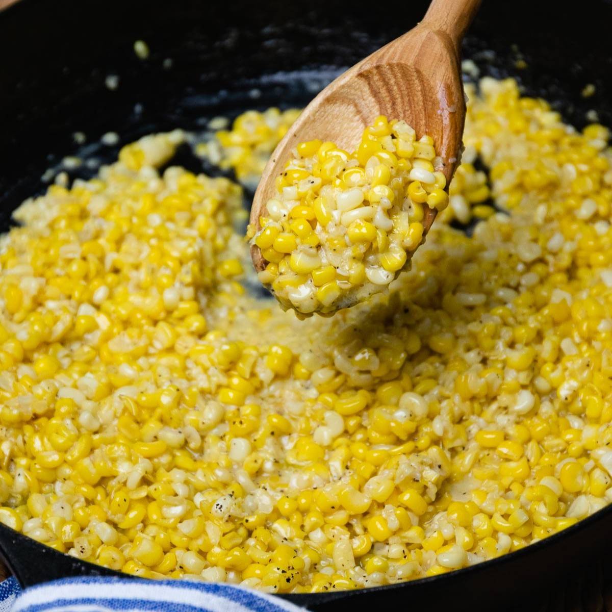 A classic creamy skillet side dish made with fresh corn, bacon drippings, and butter.